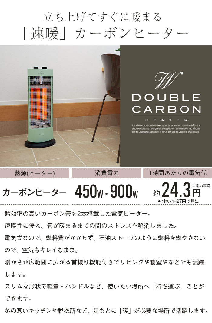 製品サイズ 約幅30×奥行24×高さ67.8cm重量約2.3kg電源素材・材質[本体]ABS+PC、PP[スタンド]ABS[スポークガード]スチール[反射板]アルミ、SUS一時間あたりの電気代目安約24.3円 ※強使用時▲(1/kw/h=27円)で算出電源コード約1.8m主な特徴□ 強弱切替:900W/450W□ 120分オフタイマー□ 自動首振り□ 首振り角度:自動首振り 70°、手動首振り 60°□ 転倒OFFスイッチキーワードカーボンヒーター 首振り 省エネ レトロ 電気ストーブ 速暖 暖房器具 電気ヒーター 暖房機 脱衣所 トイレ 洗面所 お風呂 暖かい あったか 足元 オフィス コンパクト ストーブ ヒーター 電気 おしゃれ かわいい 訳あり 新品 アウトレット商品情報エアコンの風が届きにくい場所や、パーソナルスペースで活躍する「速暖カーボンヒーター」熱効率の高いカーボン管を2本搭載したカーボンヒーター。