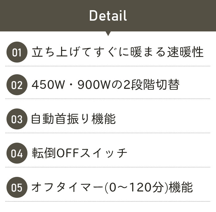 製品サイズ 約幅30×奥行24×高さ67.8cm重量約2.3kg電源AC100V 50/60Hz素材・材質[本体]ABS+PC、PP[スタンド]ABS[スポークガード]スチール[反射板]アルミ、SUS一時間あたりの電気代目安約24.3円 ※強使用時▲(1/kw/h=27円)で算出電源コード約1.8m主な特徴□ 強弱切替:900W/450W□ 120分オフタイマー□ 自動首振り□ 首振り角度:自動首振り 70°、手動首振り 60°□ 転倒OFFスイッチキーワードカーボンヒーター 首振り 省エネ レトロ 電気ストーブ 速暖 暖房器具 電気ヒーター 暖房機 脱衣所 トイレ 洗面所 お風呂 暖かい あったか 足元 オフィス コンパクト ストーブ ヒーター 電気 おしゃれ かわいい 訳あり 新品 アウトレット