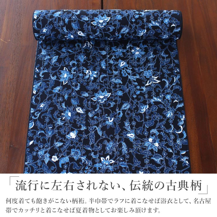 半巾帯でラフに着こなせば浴衣として、名古屋帯でカッチリと着こなせば夏着物としてお楽しみ頂け、着物愛好家の方や大人女性の方に発表以来、長年親しみ好まれている夏の着物です。